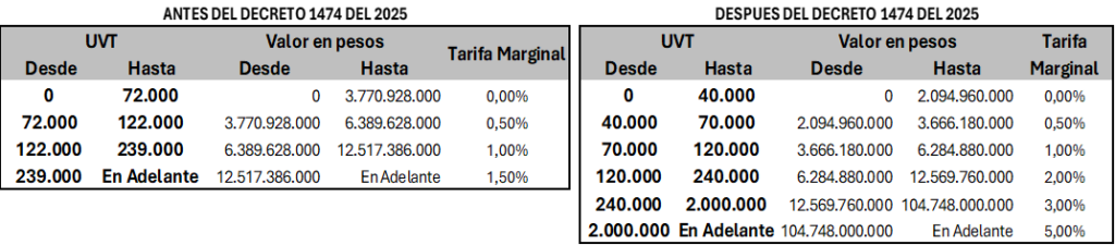 Se amplía de manera significativa la base de contribuyentes del impuesto al Patrimonio, al reducir el umbral de obligación de 72.000 UVT, $3.770.928.000, a 40.000 UVT, $2.094.960.000, incorporando nuevos contribuyentes que antes no se encontraban obligados.